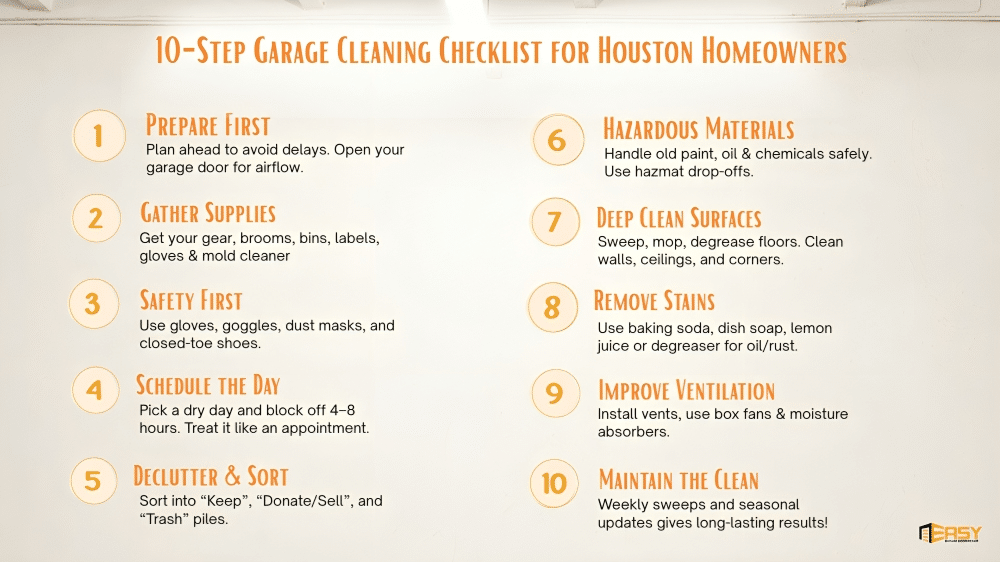 Transform your cluttered garage into a well-organized space by following these systematic garage cleaning checklist steps. Each stage is designed to build on the previous one, ensuring a comprehensive, clean, and long-lasting organization.